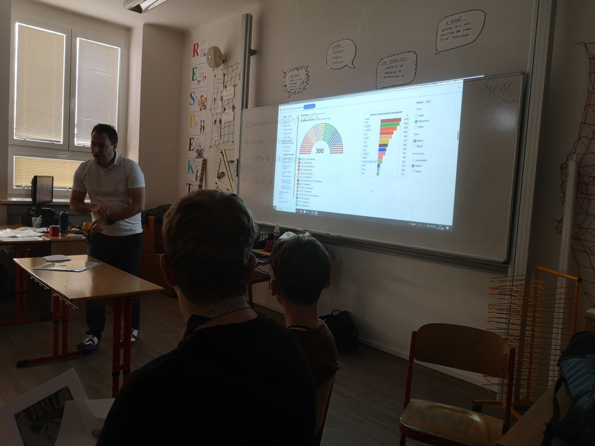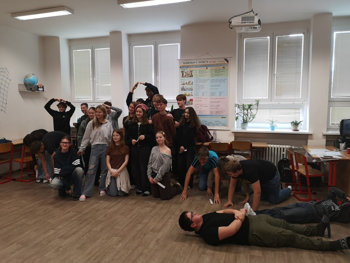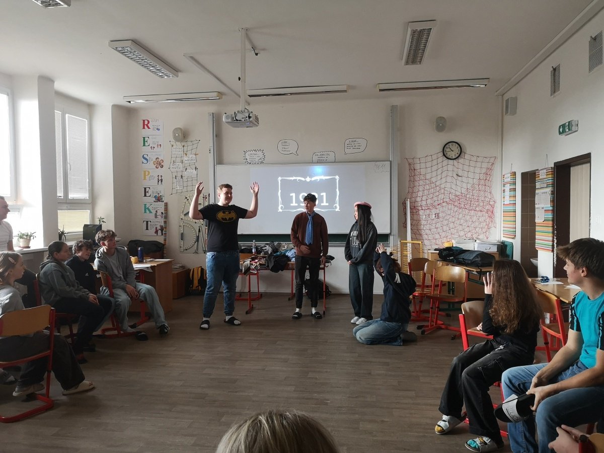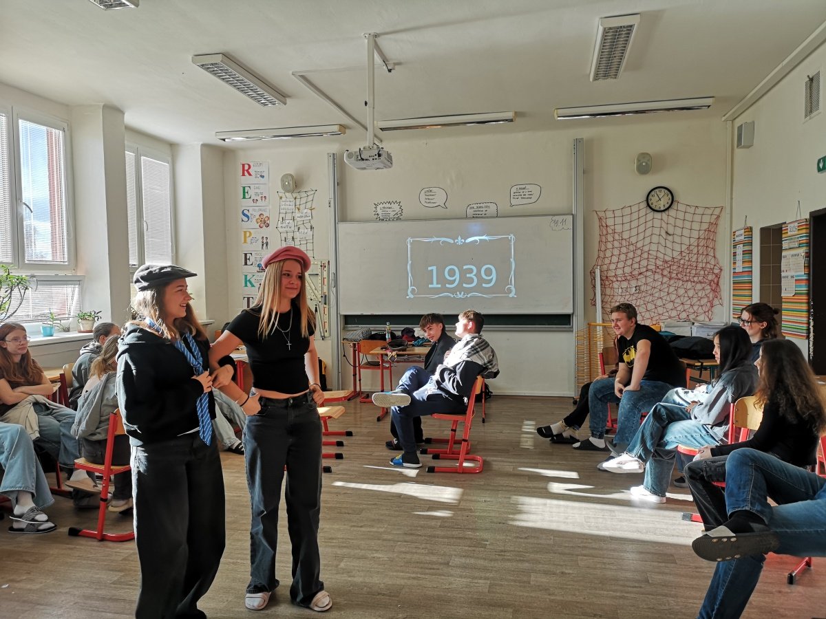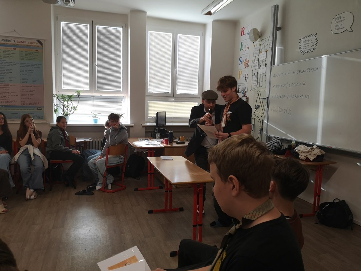 V úterý 18. 11. se žáci 9.C zúčastnili zážitkového workshopu Paměti národa na téma Doma a jinde. Na úvod byli vyzváni, aby se zamysleli nad tím, co pro ně znamená domov. Následně se společně s lektory ponořili do atmosféry Československa třicátých let, kdy se tehdejší společnost začínala pozvolna měnit – a ne vždy dobrým směrem. Na dobových reáliích si ukázali principy fungování zastupitelské demokracie v roce 1935, ale i vzestup antisemitismu a xenofobie ve společnosti.